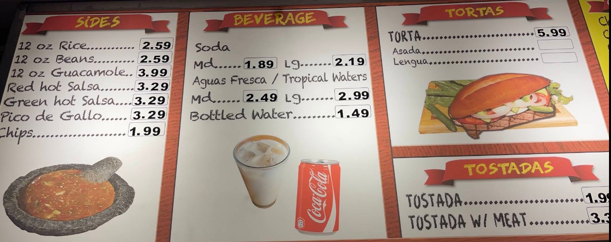 The drinks are cheap and tasty. The beef isn’t great. The avocado is either ripe or black. The tortas aren’t great that’s what I had. The torta bread was burnt. It had cream, decent amount of meat, tomato, onion and avocado. The sauce taste great and service is great. Their food isn’t good, I couldn’t force myself to eat it and I went to McDonald’s.